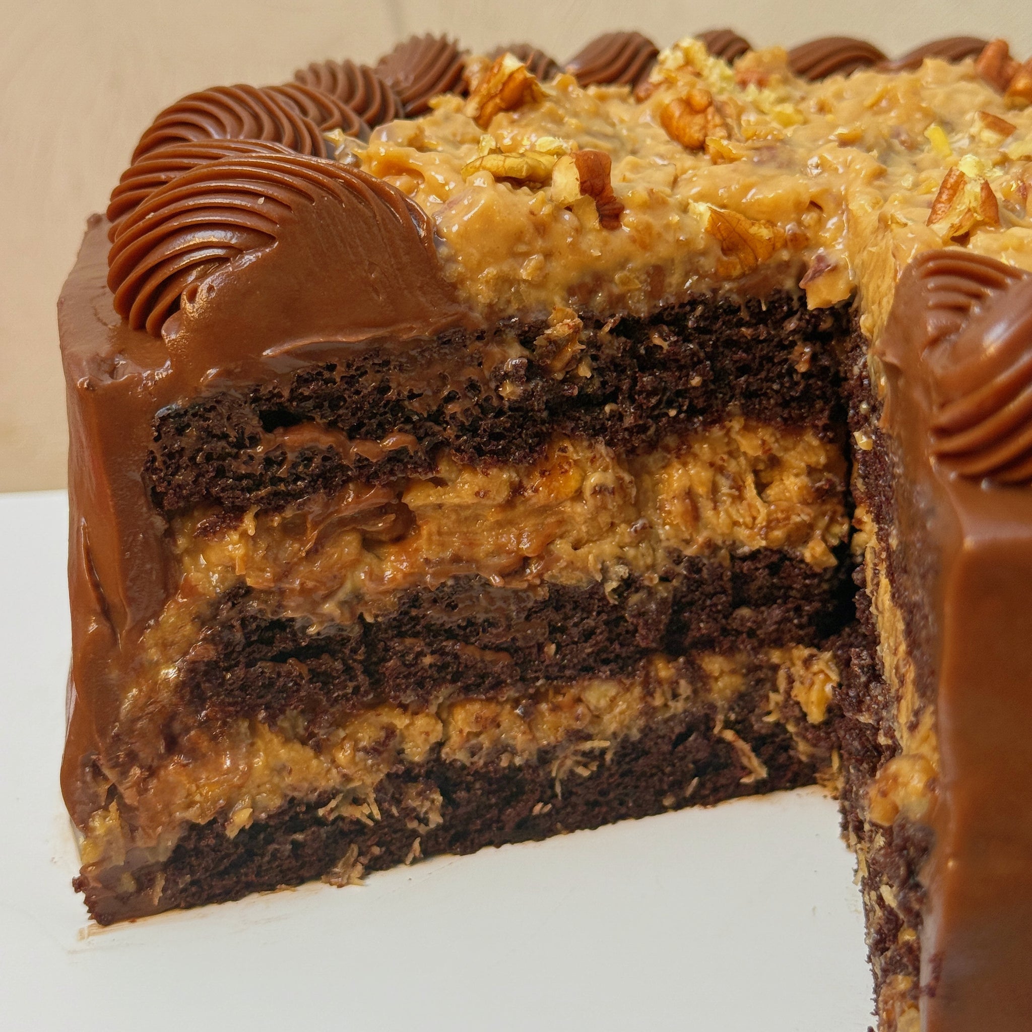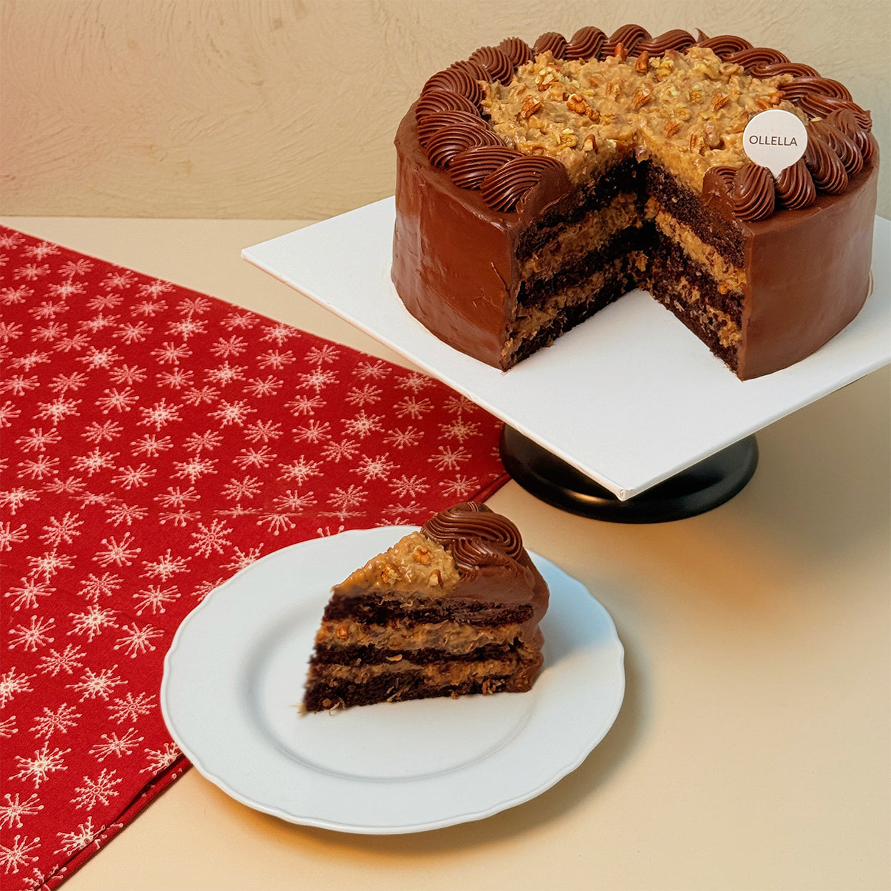 Celebrate the season with Ollella’s Double Coco Christmas Crown — a decadent three-layer dark chocolate cake crowned and filled with a luscious walnut-pecan-coconut gula melaka frosting, then enveloped in smooth dark chocolate cream.
