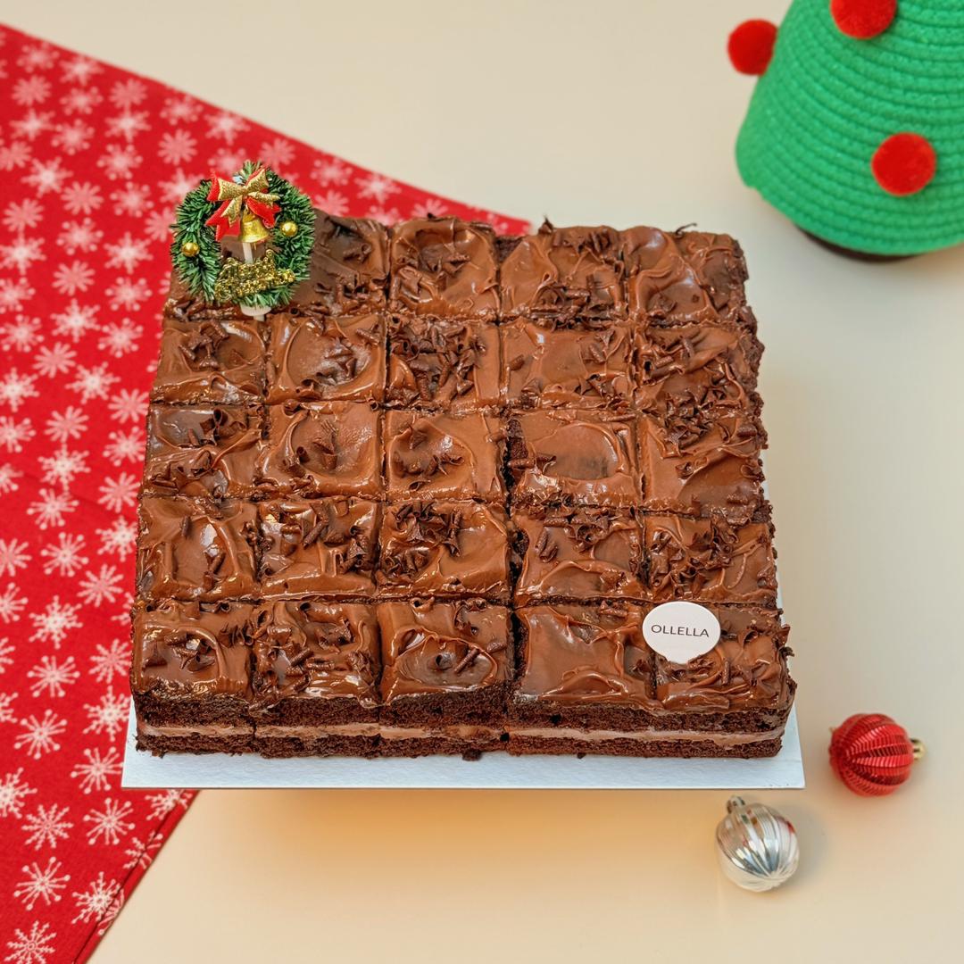 Extremely moist dark chocolate sponge sandwiching a bitter-sweet chocolate ganache, lastly generously drizzled with luscious semi-sweet chocolate frosting. Decadence in every bite, chocolate lovers dream. 25x25cm, precut to 30 pcs.