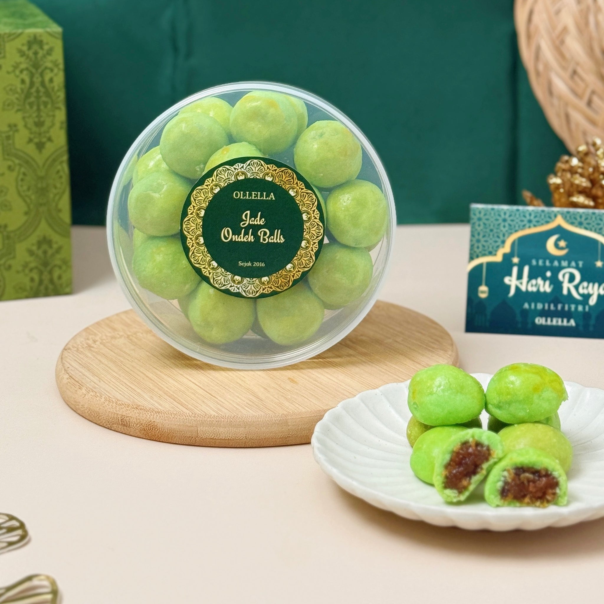 Signature Ondeh Balls, made with our signature moist coconut gula Jawa filling encrusted in a melt-in-mouth pandan butter cookie. All cookies are made without preservatives
