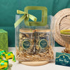 2 jars of signature crackers in a beautiful clear emerald green handle tote